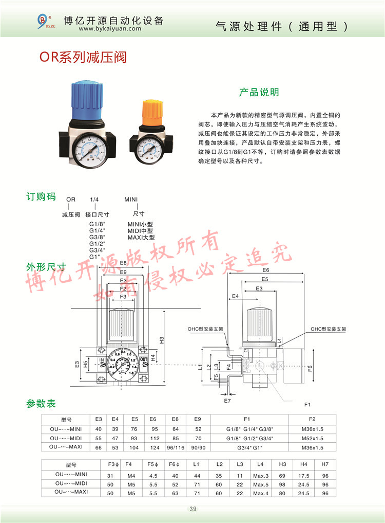 OR系列調壓閥即使輸入壓力與壓縮空氣消耗產(chǎn)生系統(tǒng)波動也能保證其設定的工作壓力非常穩(wěn)定,其主要的尺寸由G1/8到G1寸之間,更多的技術咨詢請聯(lián)系本公司技術部:0371-85612788。