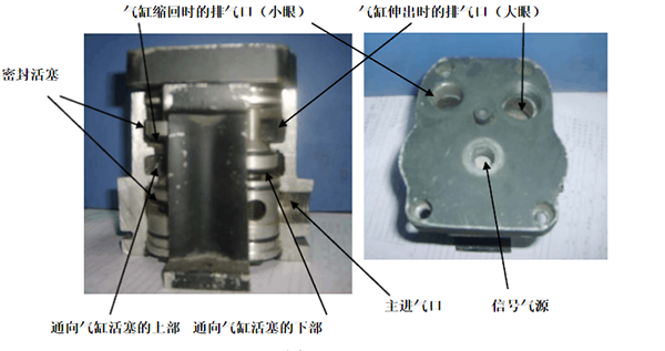 打殼氣缸上的高溫閥的剖視如下圖,主進氣口是常供氣源進口,信號氣源主要是管控制高溫閥動作,它通氣達到一定壓力后會推動兩活塞,活塞同時推動閥芯動作,使其達到氣路在高溫閥體內(nèi)部進行切換。當(dāng)高溫閥的主進氣口接通氣源后,信號氣源無氣源信號,這時高溫閥右側(cè)的閥芯上的上密封把通常大口的排口堵住,左側(cè)的閥芯下活塞的上密封把進入氣缸活塞上部氣室進口堵住,這時氣源由高溫閥右側(cè)的氣缸下氣室進口進入到氣缸的下部,對其進行充氣,向上推動氣缸的活塞,氣缸上氣室的氣體由高溫閥的左側(cè)部分的上氣室進口進入高溫閥,由高溫閥的小眼排氣口排出,在這個過程中,可以看出,如果不打殼時,高溫閥大口漏氣,一定是高溫閥右側(cè)閥芯的上密封壞,如果是小眼漏氣,則有兩種可能,一是打殼氣缸體內(nèi)的活塞內(nèi)漏,一般漏氣會很。欢歉邷亻y左側(cè)的閥芯下活塞的上密封;所以當(dāng)出現(xiàn)小眼漏氣時,可更換高溫閥試一下,看故障點在什么位置。當(dāng)高溫閥的主進氣口接通氣源后,信號氣源有氣源信號時,這時高溫閥右側(cè)的閥芯上的下密封把通向氣缸下氣室的進氣口堵住,同時把下氣室的進氣口切換通向高溫閥的大眼排氣口,高溫閥左側(cè)的閥芯在動作活塞的推動向下移動,上密活塞的下密封把氣缸活塞上部氣室進口通向高溫閥小眼排氣口堵住,同時下密封活塞上密封打開進入氣缸活塞上部氣室進口,這時氣源由高溫閥左側(cè)的氣缸上氣室進口進入到氣缸的上部,對其進行充氣,向下推動氣缸的活塞,氣缸下氣室的氣體由高溫閥的右側(cè)部分的下氣室進口進入高溫閥,由高溫閥的大眼排氣口排出,在這個過程中,可以看出,如果在打殼時,高溫閥小眼排氣口漏氣,是高溫閥左側(cè)閥芯上密封活塞的下密封壞,如果是氣缸動作到位后小眼漏氣,是高溫閥右側(cè)閥芯密封活塞的下密封壞,如果在打殼時出現(xiàn)喘動,說明是高溫閥的推動活塞壞。