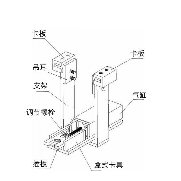 電解多功能天車陽極夾具防脫落的裝置包括盒式卡具、U 型支架和兩個吊耳,吊耳分別通過卡板固定于支架的兩側(cè)板頂端,盒式卡具平托置于支架的底板上,還包括調(diào)節(jié)螺栓、插板和氣缸,調(diào)節(jié)螺栓與氣缸的伸縮套筒配套,調(diào)節(jié)螺栓驅(qū)動插板沿盒式卡具內(nèi)側(cè)的滑槽移動。